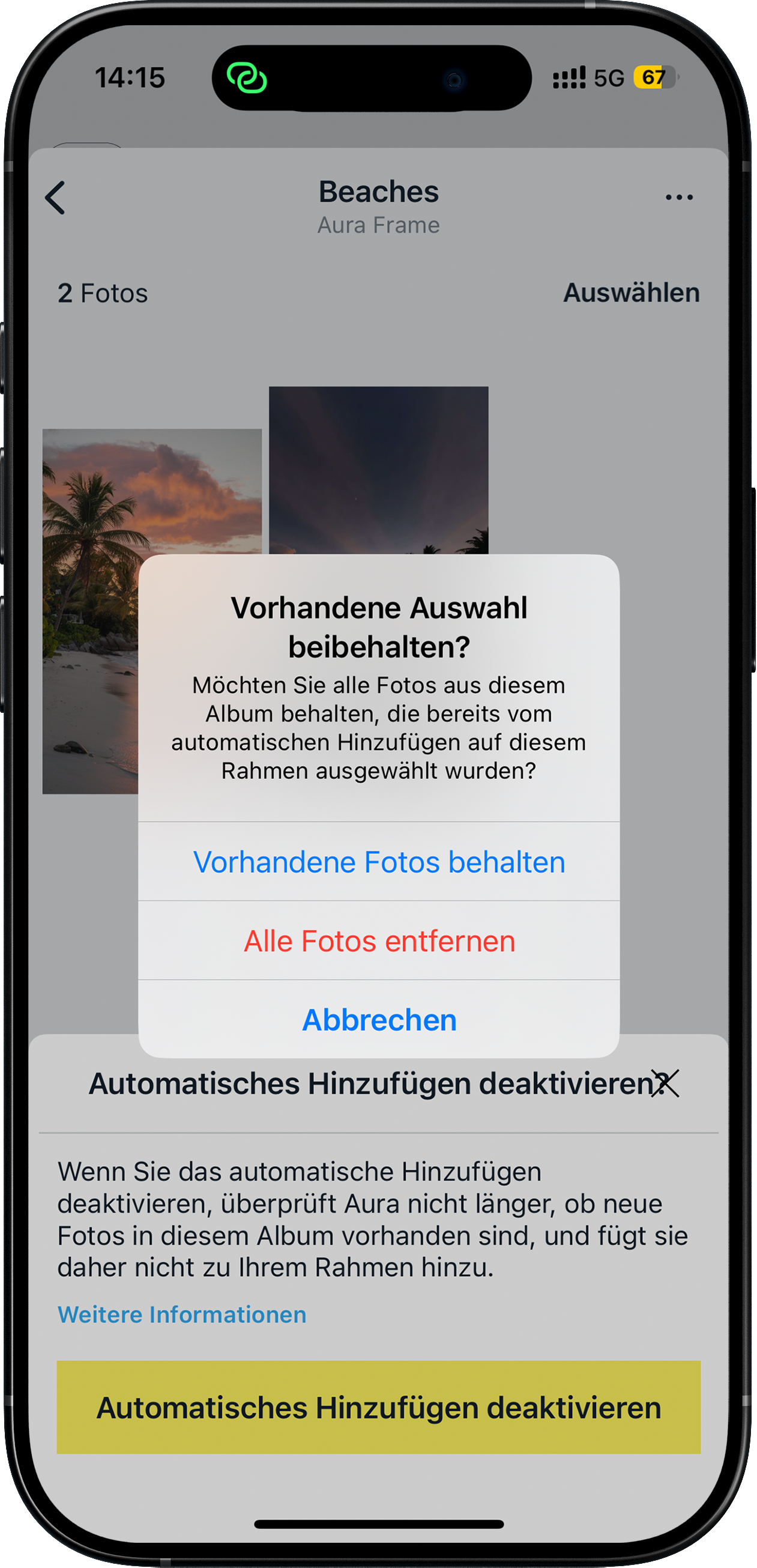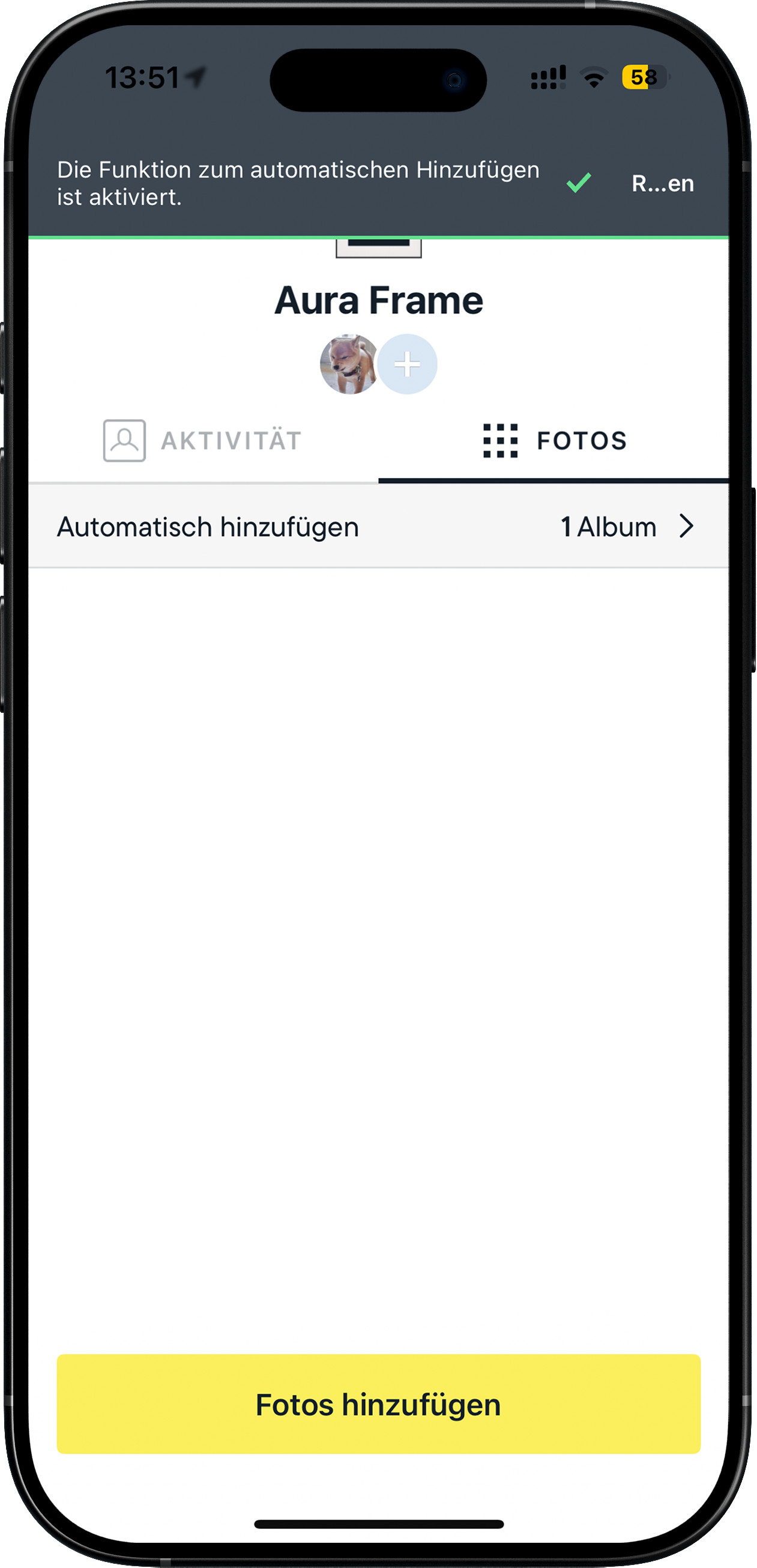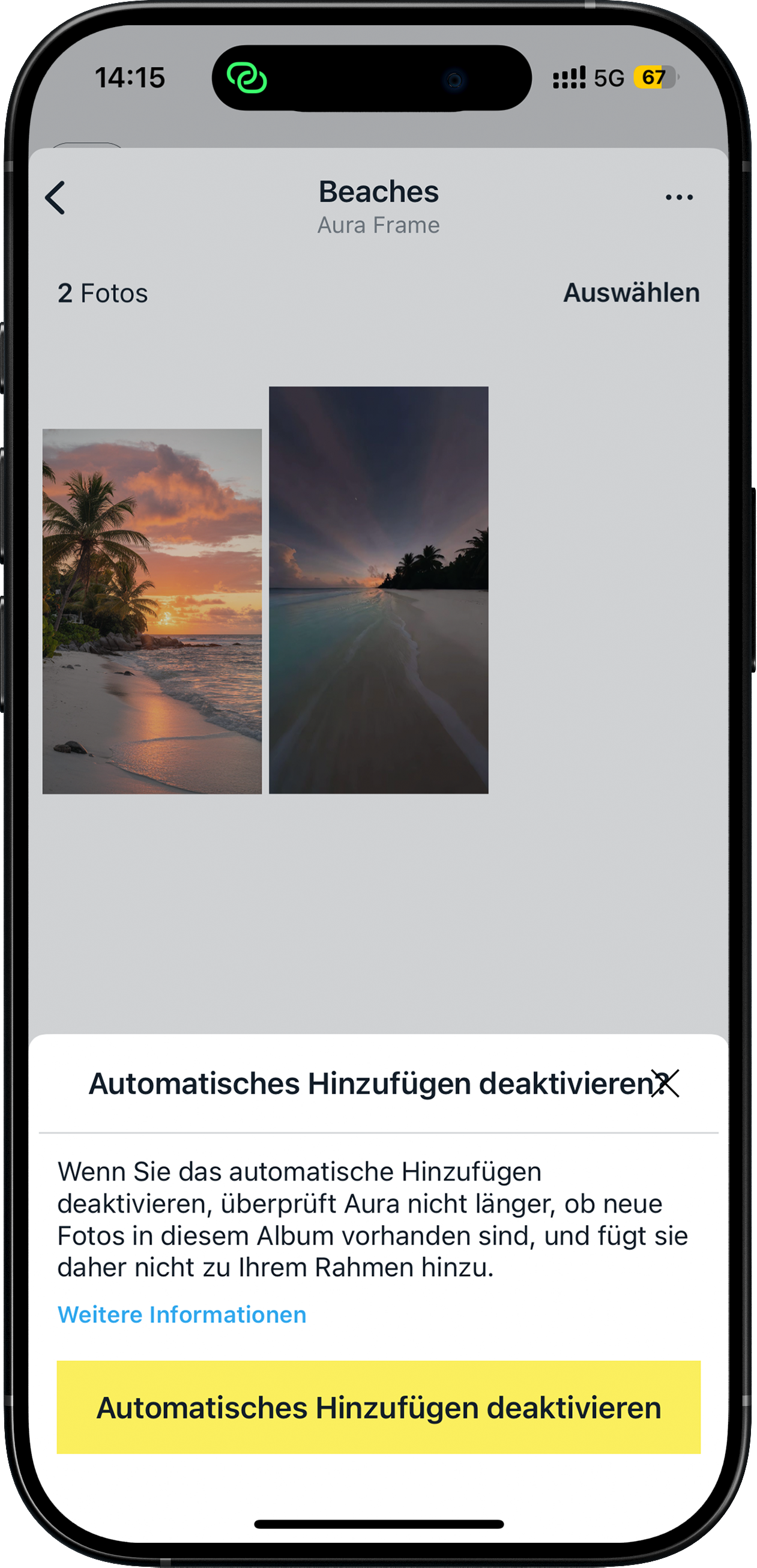 Wenn Sie „Automatisch hinzufügen“ deaktivieren, überwacht Aura dieses Album nicht mehr und fügt keine neuen Fotos aus diesem Album mehr zu Ihrem Rahmen hinzu.