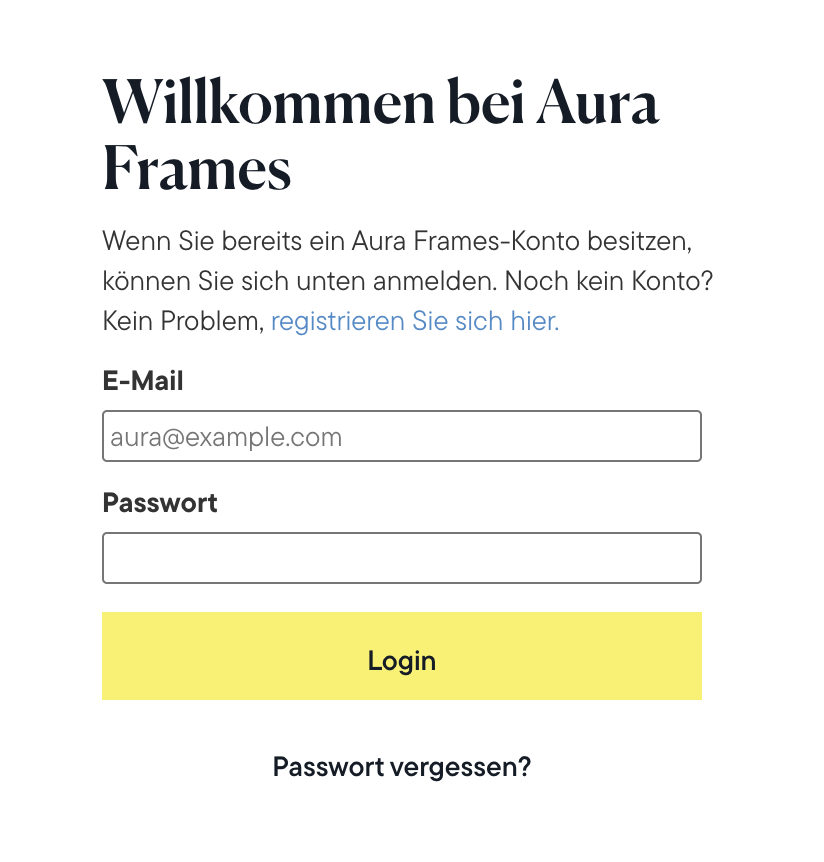 Rufe http://app.auraframes.com/ in einem Webbrowser auf deinem Computer auf und melde dich mit deiner E-Mail-Adresse und deinem Passwort bei deinem Aura-Konto an. Wenn du noch kein Konto hast, klicke auf „hier registrieren“, um eines zu erstellen: