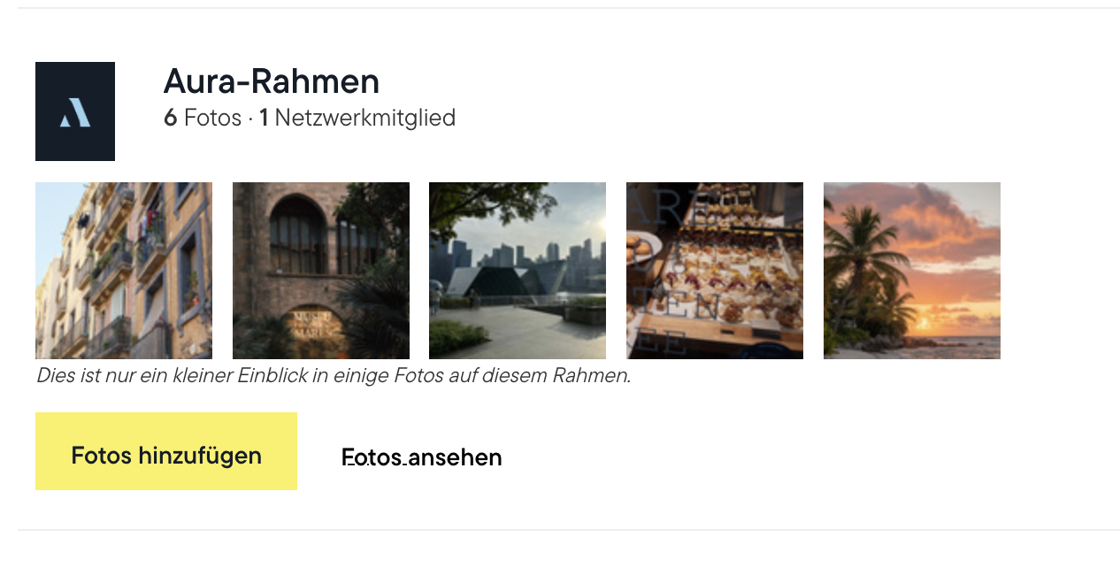 Für erweiterte Funktionen wie das Hochladen von Videos, das Synchronisieren ganzer Alben oder das Anpassen der Frame-Einstellungen empfehlen wir die Aura App für iOS oder Android, die das umfassendste Erlebnis bietet.