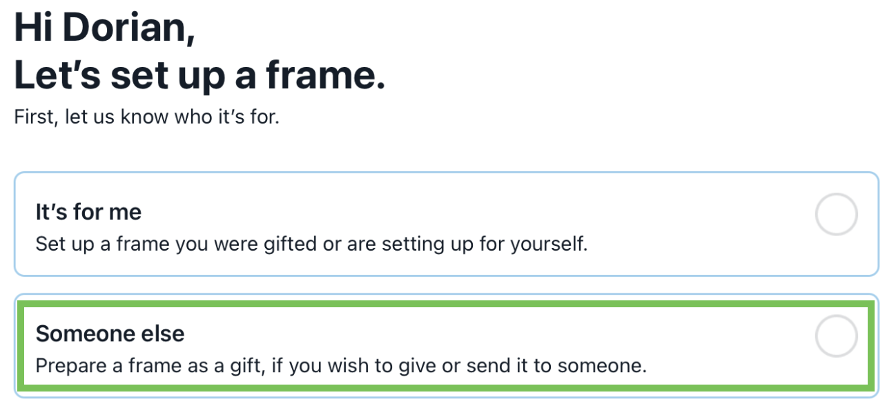 IMPORTANT: the first installation step will ask who the frame is for. Please select "it's for me", not "it's for someone else". The second option will start the gift preparation mode which is not the correct path for setting up a frame on behalf of the owner. -