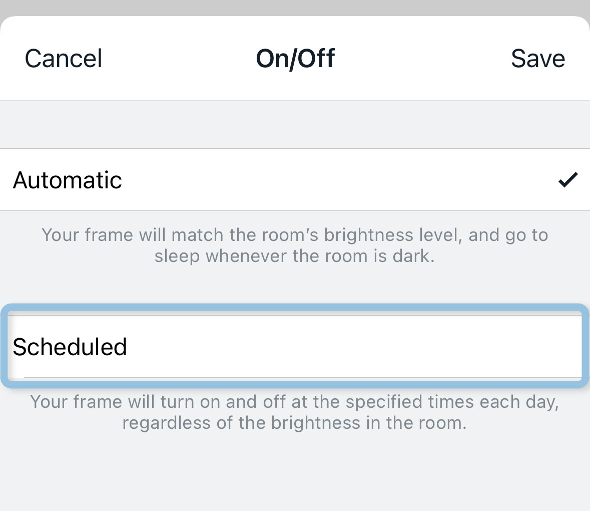 Once a schedule is set, your Aura frame will turn on and off at the designated times each day.