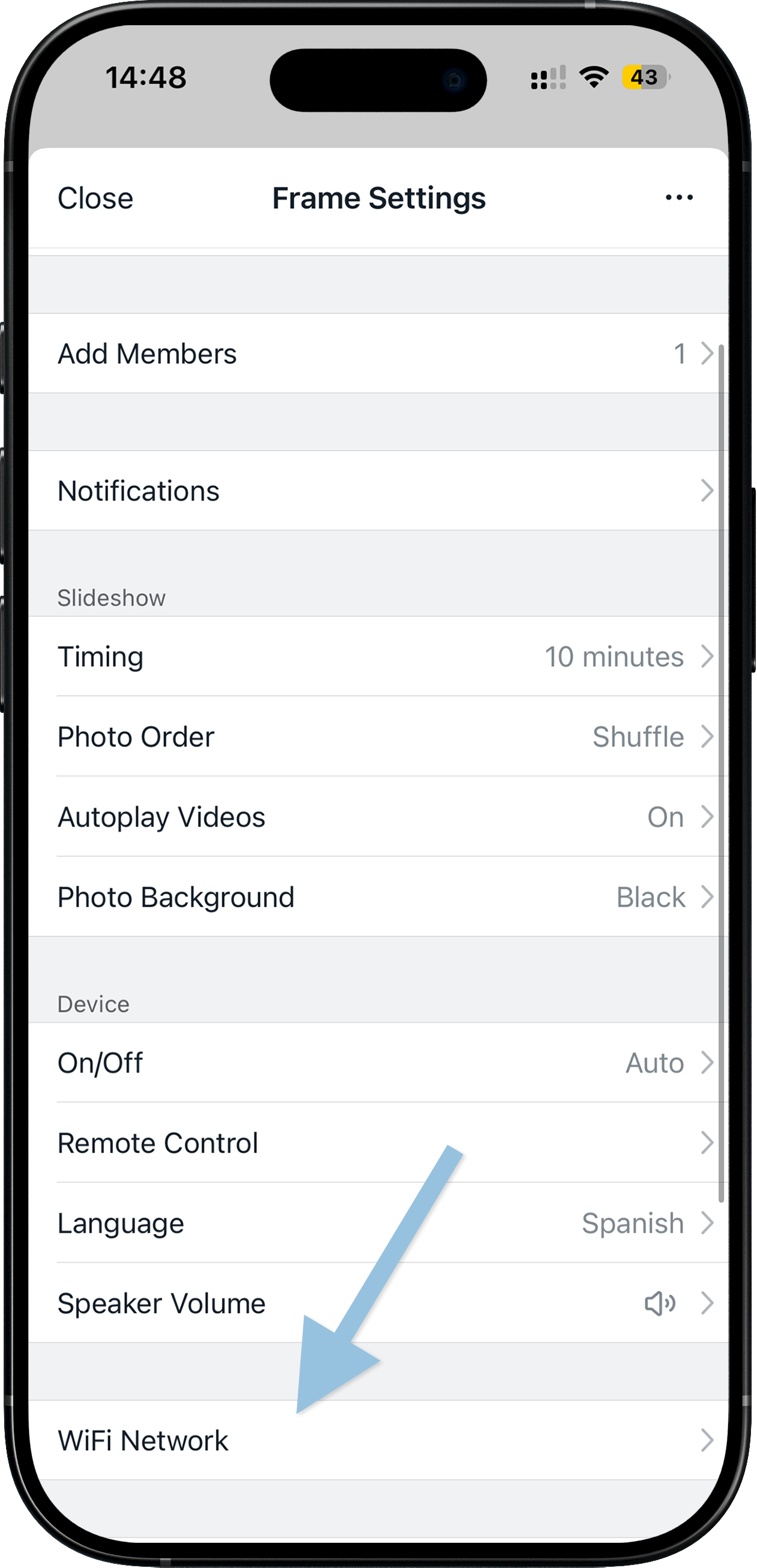 Next, tap on your frame name before scrolling down to where you'll see the option "WiFi Network."