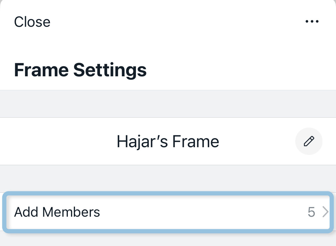 Then, tap on the ". . ." icon and leave the frame. Please be aware, all your photos will be removed from this frame since your account is no longer part of it.