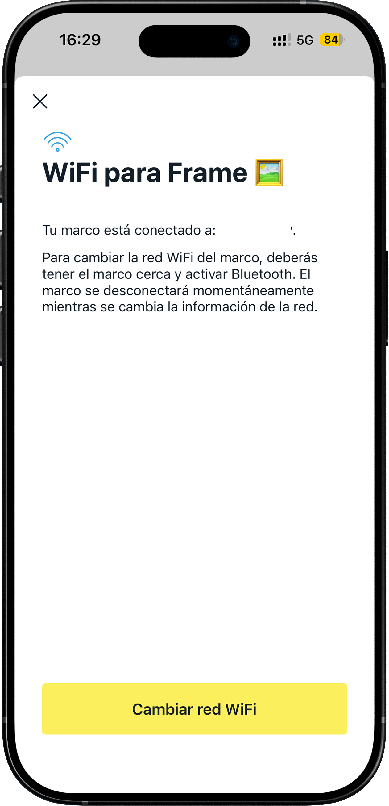 Este artículo explica cómo cambiar la red WiFi de un marco que ya ha sido configurado. Si necesitas cambiar la red para conectar el marco a una "red de portal cautivo", por favor lee este artículo en su lugar. Normalmente, actualizar tu WiFi se puede hacer a través de la configuración del marco. Sin embargo, si este método no funciona, configurar el marco como un dispositivo nuevo ayudará a reconectarlo sin perder tus fotos o colaboradores.