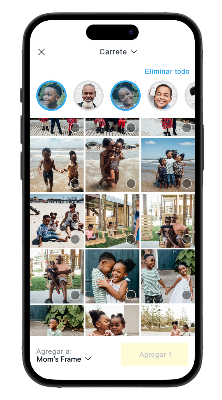 Cuando se añaden FOTOS NUEVAS a Aura, la función de Búsqueda de Personas muestra una interfaz simple e intuitiva. En la pantalla de ‘Añadir Fotos’, usted verá los rostros de las personas que aparecen con frecuencia en las fotos a las que usted ha concedido acceso a la aplicación de Aura. Al seleccionar estos rostros, usted puede filtrar sus fotos y añadirlas a Aura con facilidad.
