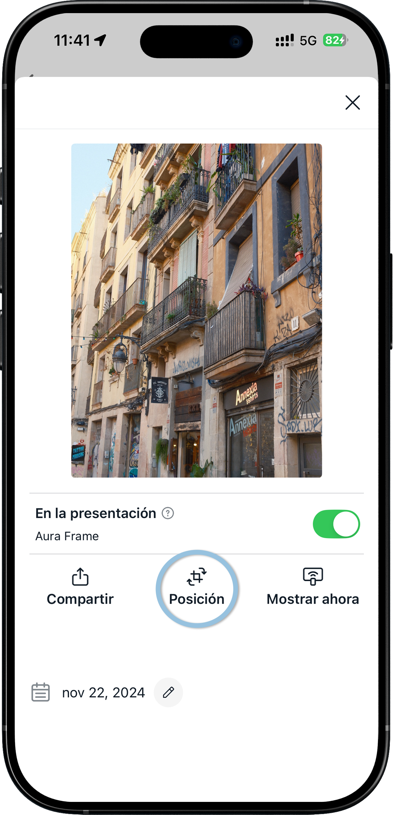Toque la foto individual en la sección "Fotos" de su aplicación Aura Frames y después seleccione "Posición":