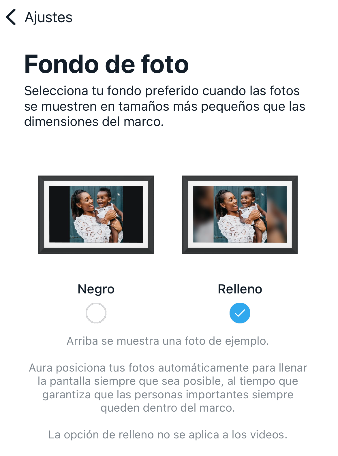 Nota: También puede seleccionar su opción de fondo preferida en la configuración de la aplicación Aura. Las fotos se mostrarán en el centro de su marco con un fondo negro o un fondo relleno. |