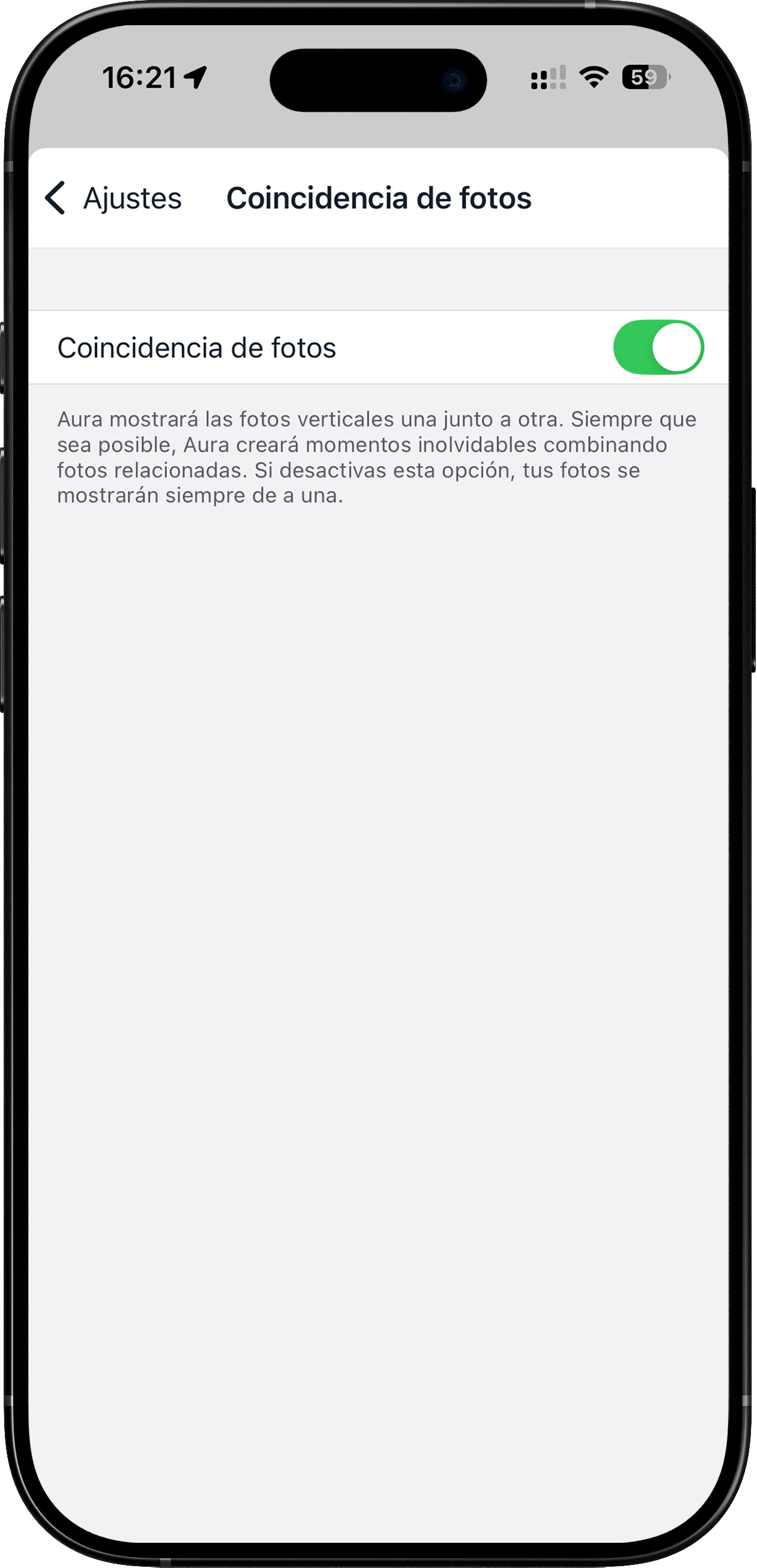 Nota: También puedes seleccionar tus opciones de fondo preferidas en la configuración de la aplicación de Aura. Las fotos se mostrarán en el centro de tu marco con un fondo negro o un fondo relleno.