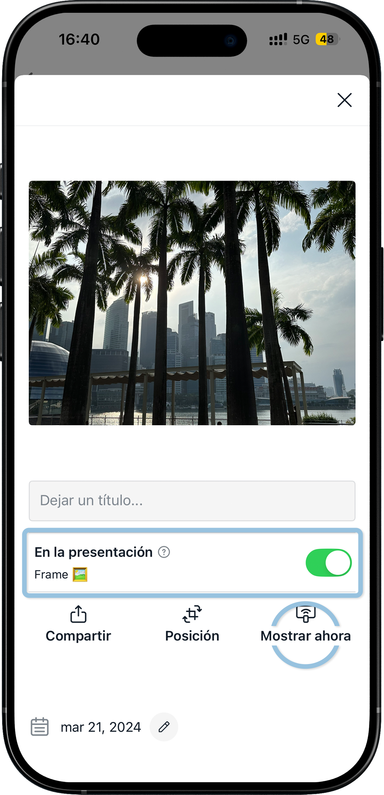 En la presentación significa que la foto o el video se muestra en tu marco Aura.
