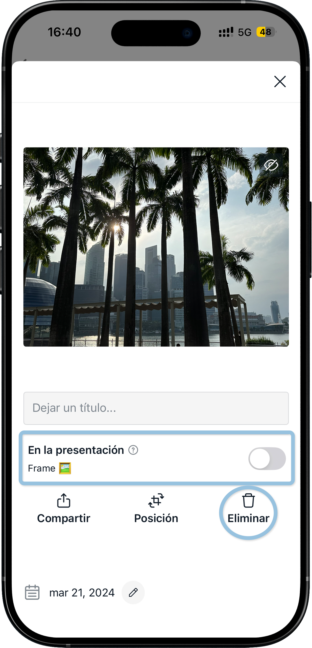 Cada foto o video añadido a tu marco tiene un interruptor llamado “En la presentación”.