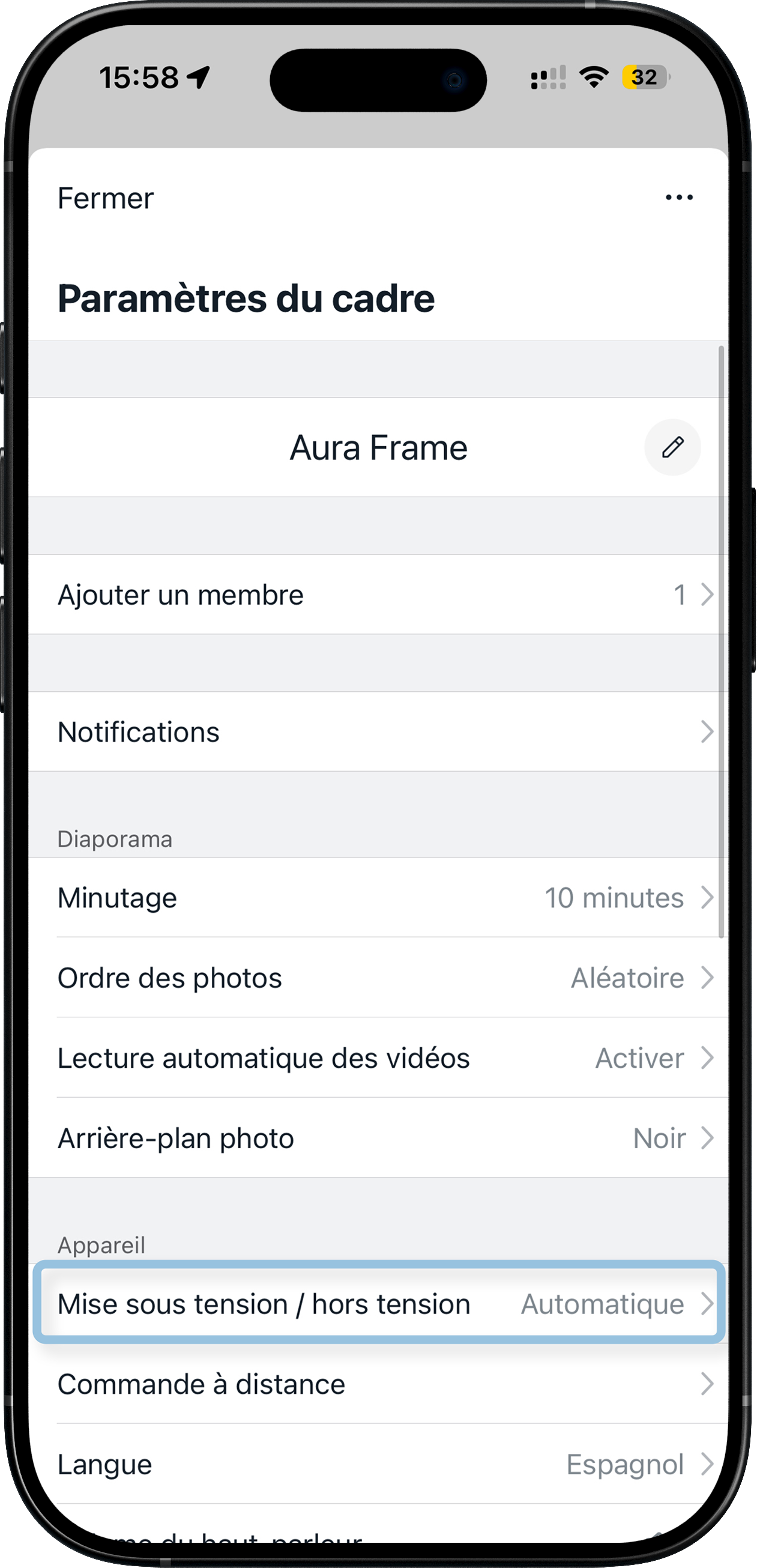 Une fois la programmation définie, votre cadre Aura s’allumera et s’éteindra automatiquement aux horaires choisis chaque jour.