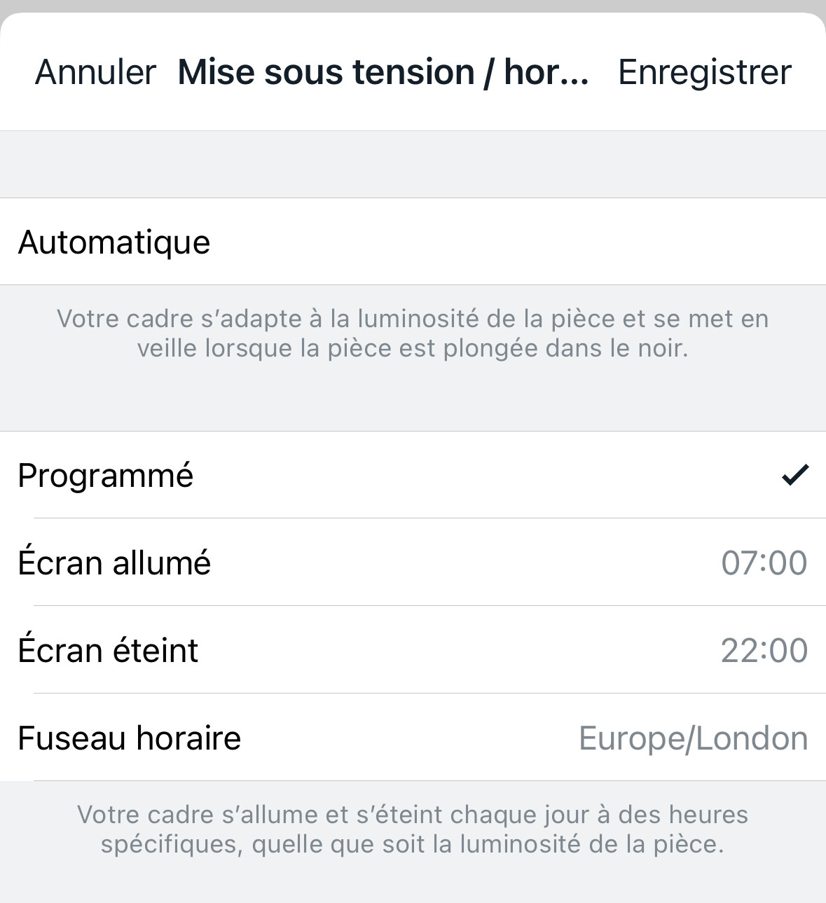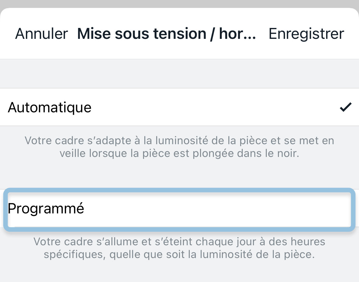 Si vous souhaitez que votre cadre s’allume et s’éteigne aux mêmes heures chaque jour, indépendamment de la luminosité de la pièce, vous pouvez utiliser l’option Programmation. Cette fonctionnalité est parfois appelée la minuterie de veille du cadre.