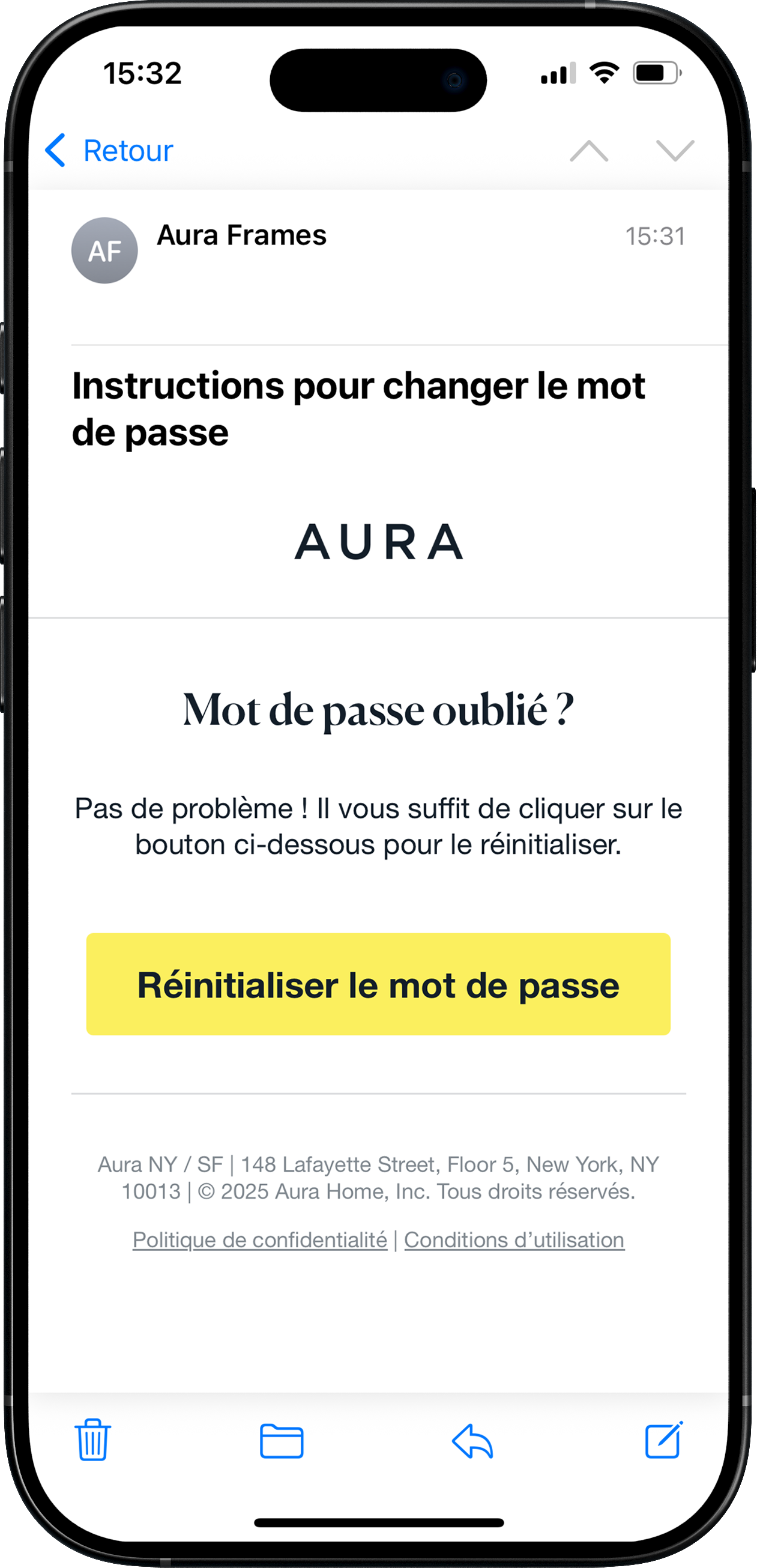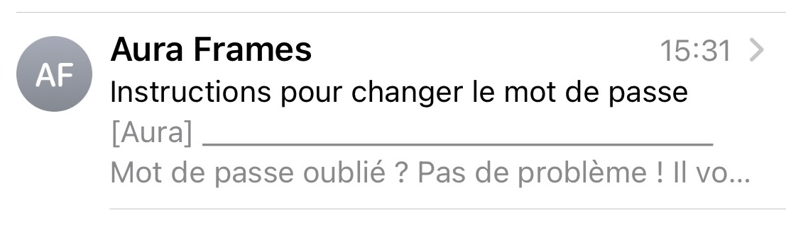 Il existe plusieurs entreprises nommées Aura. Nous sommes Aura Frames. Veuillez utiliser le bon lien de réinitialisation du mot de passe : https://app.auraframes.com/reset_password